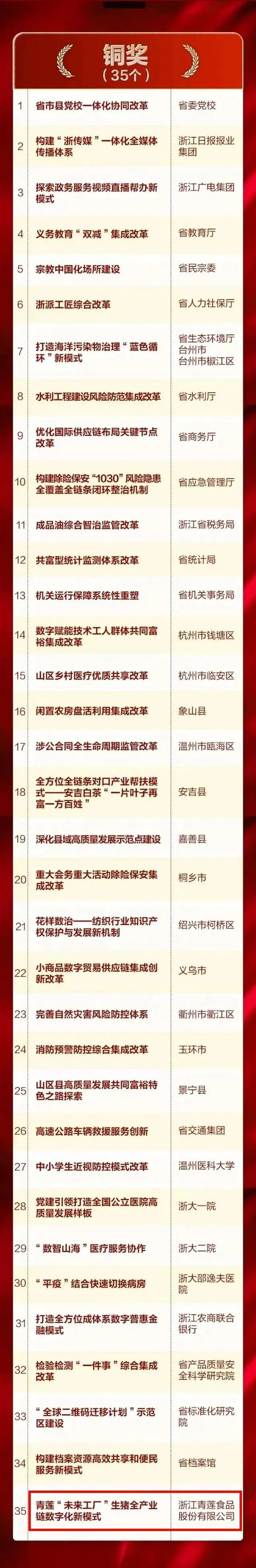 重磅!青蓮食品—膳博士榮獲浙江改革突破獎銅獎! 2023-02-01 09:20:19 浙江青蓮食品股份有限公司 瀏覽次數 2633 近日,浙江省委改革辦公布了2022年度浙江省改革突破獎名單。浙江青蓮食品股份有限公司“數智青蓮”未來工廠榮獲2022年度浙江省改革突破獎銅獎,是銅獎組中唯一的一家民營企業。20多年來,青蓮食品構建起從農場到餐桌的透明全產業鏈,在改革創新中以種業為源頭,建立起未來農場—未來工廠—產業新零售等數字化應用,真正從用戶需求出發為社會提供優質食品!此次獲得浙江改革突破獎銅獎,更是對青蓮食品數字化轉型成果的肯定和勉勵!實現黑豬專家膳博士在安全和美味雙升級上硬核突破!身為黑豬專家,膳博士服務過世博會、世乒賽、國際馬拉松比賽,連續8年為世界互聯網大會供肉,連續14年為中國極地研究中心供肉,成為杭州亞運會官方生鮮肉類產品供應商。以國家級嘉興黑豬和兩頭烏保種場作為種業基礎繁育國家級優質新品種,形成完整的黑豬商品體系為消費者帶來舌尖體驗。近年來,通過智慧養殖為傳統畜牧產業數字化轉型先行探路,以新一代信息技術為手段,重塑生豬全產業鏈生產組織方式和管理服務模式,構建“1+4+N”模型,推動全產業鏈數字化轉型。產業零售端以用戶需求為中心持續推出膳博士黑豬鮮肉鮮制系列產品提升消費體驗,滿足國人對美好生活、品質食品的向往。2022年,青蓮智慧牧場首批入選浙江省“未來農場”,“數智青蓮”未來工廠獲全省數字化改革“最佳應用”和全省數字經濟系統“最佳應用”。在全省數字化改革大會上做匯報演示,列入全省數字經濟系統地方特色應用目錄,受到央視、省級、市縣級等媒體持續關注報道。 上一條“風云浙商”許明曙:人生把一件事做好就很不容易 下一條全國唯一!膳博士·香雪白豬獲2022年度國家新品種認定!
